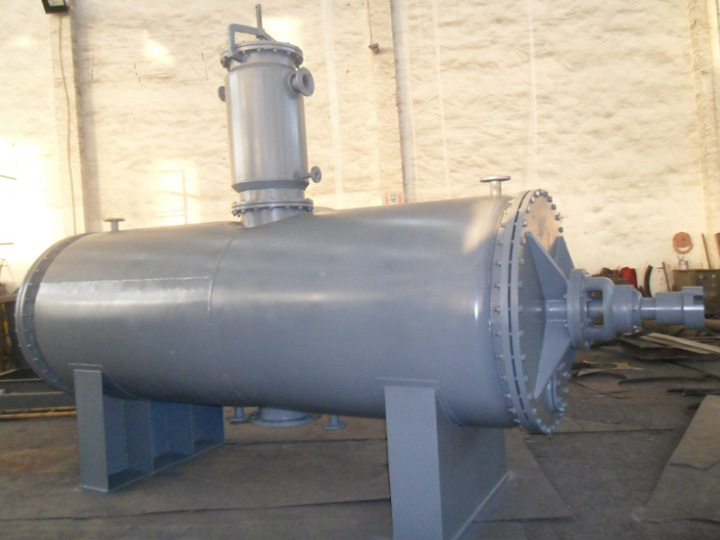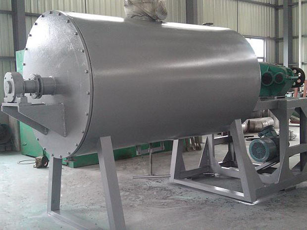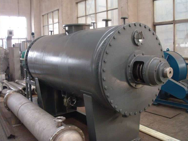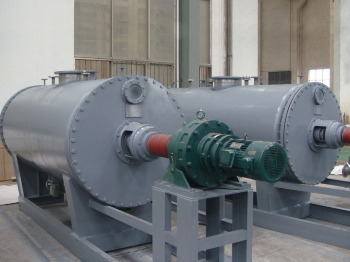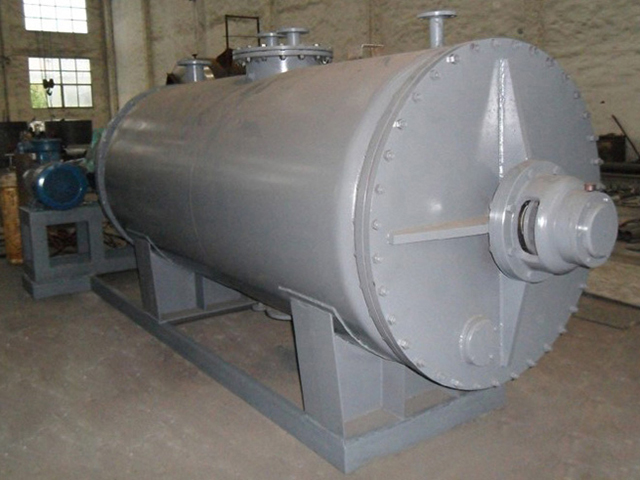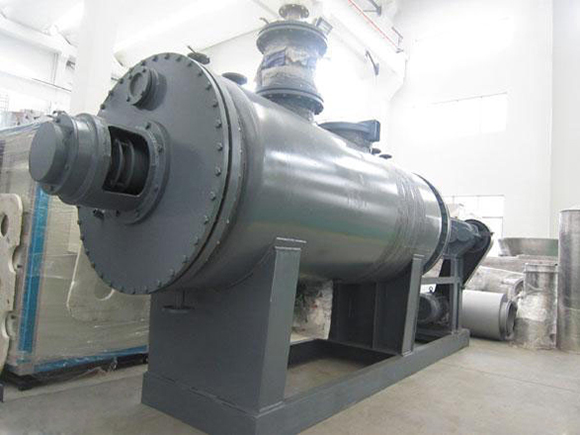 被干燥物料從殼體上方正中間加入,在不斷正反轉動的耙齒的攪拌下,物料軸向來回走動,與殼體內壁接觸的表面不斷替換,受到蒸汽的間接加熱,耙齒的均勻攪拌,粉碎棒的粉碎,使物料內的水份氣化,在真空系統的作用下,使被干燥物料內部水份和表面水份更有利的排出,氣化的水份經干式除塵器、濕式除塵器、冷凝器,從真空泵出口處放空。